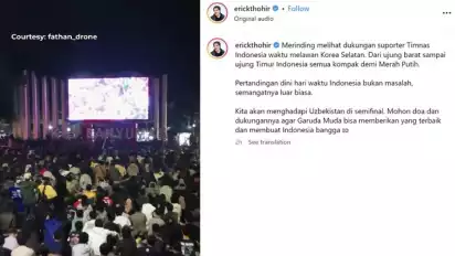 “Merinding melihat dukungan suporter Timnas Indonesia waktu melawan Korea Selatan. Dari ujung barat sampai ujung timur Indonesia semua kompak demi Merah Putih. Pertandingan dini hari waktu Indonesia bukan masalah. Semangatnya luar biasa,” tulis Erick Thohir.