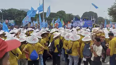 Jakarta, tvOnenews.com - Sejumlah kelompok buruh mengenakan caping atau topi petani pada demo Hari Buruh atau May Day 2024 di Patung Kuda, Monas, Jakarta Pusat, Rabu (1/4/2024).