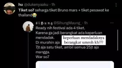 "Tiket so7 seharga tiket Bruno Mars + tiket pesawat ke thailand," kata @dukenya.