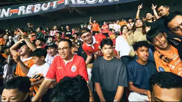 Para Jakmania pun lantas bersua foto bersama Eks Gubernur DKI Jakarta tersebut sembari menyaksikan laga berlangsung.