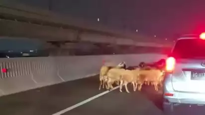 Terlihat pula sejumlah hewan kambing yang diangkut mobil tersebut berhamburan berlarian di pinggiran jalan tol.