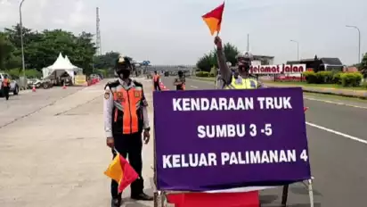 Cirebon, Jawa Barat - Mengurangi kepadatan kendaraan di Karawang, jawa Barat, Petugas kepolisian satlantas Polresta Cirebon, mengeluarkan kendaraan besar atau sumbu tiga dari jalur tol ke arteri di Gerbang Tol (GT) Palimanan 4.