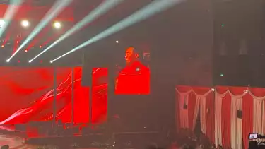 Dua layar besar di samping panggung kemudian langsung menampilkan Andika yang berdiri dari kursinya bersikap hormat. Andika juga terlihat memakai kemeja kader PDIP.
