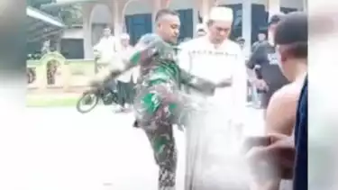 Akibat tendangan tersebut, warga sekita pun emosi hingga melerai oknum TNI itu agar pergi dari lokasi kejadian.