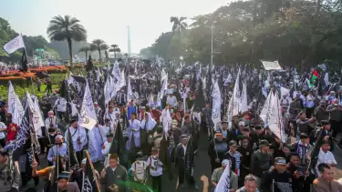 Jakarta, tvOnenews.com - Ribuan massa pembela Palestina kembali mengggelar aksi di kawasan Patung Kuda, Monas, Jakarta Pusat pada Sabtu (8/6/2024).