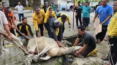 Medan, tvOnenews.com - Berbagi keberkahan di hari raya Iduladha 1445 Hijriah, Pimpinan Kecamatan (PK) Partai Golongan Karya (Golkar) Medan Polonia, Rommy Van Boy laksanakan penyembelihan 1 ekor sapi seberat 400 kilogram.