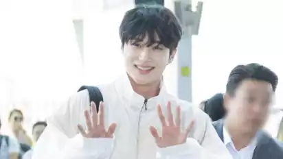 Ia tampak tersenyum ke arah kamera wartawan dan fans yang menunggu di bandara. Pemeran di drama Strong Women Gang Nam-soon itu sesekali membuat heart sign ke arah penggemar.