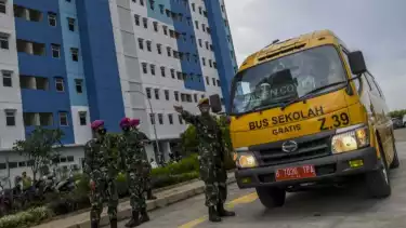 Prajurit TNI mengarahkan bus sekolah yang membawa pasien COVID-19 di Rumah Susun Nagrak, Cilincing, Jakarta Utara
