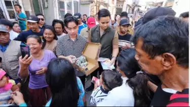 Gibran juga membagikan susu UHT dan buku tulis bersampul gambar hewan ke anak-anak, disambut antusias masyarakat yang ingin foto bersama dan bersalaman.