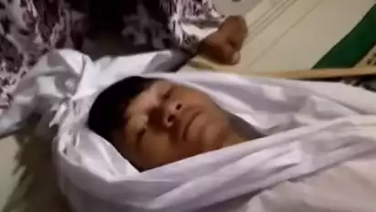 Saka Tatal menjalani sumpah pocong di Padepokan Amparan Jati Cirebon selepas menjalankan ibadah salat Jumat.