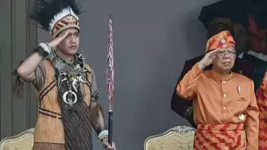 Sementara itu, Gibran didampingi Selvi Ananda mengenakan busana adat Lampung berwarna biru malam dengan hiasan kepala berwarna emas.