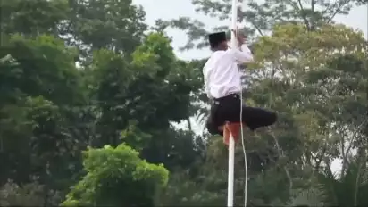 Tanpa pikir panjang, Reza dengan penuh keberanian memutuskan untuk memanjat tiang bendera guna memperbaiki tali yang terlepas itu, meski kondisi tiang terlihat tidak stabil dan ia tidak dilengkapi dengan alat pengaman apapun.
