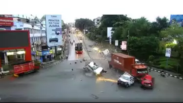 Balikpapan, Kaltim - Truk kontainer KT 8534 AJÂ yang remnya blong saat melaju di jalan menurun Simpang Rapak, Balikpapan, Kalimantan Timur menabrak puluhan kendaraan yang tengah berhenti di traffic light (TL). Sedikitnya ada 21 kendaraan yang ditabrak truk besar itu.