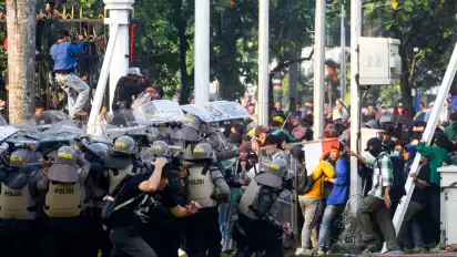 "Woy polisi dibayar berapa lo," teriak pendemo kepada aparat yang mulai menembaki gas air mata, Jakarta, Kamis (22/8/2024).