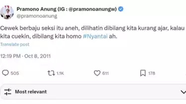 "Cewek berbaju seksi itu aneh. Dilihatin dibilang kita kurang ajar. Kalau kita cuekin dibilang kita homo. #Nyantai ah," tulis Pramono Anung tanggal 8 Oktober 2011.