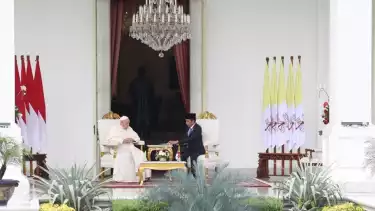 Pantauan tvOnenews.com, Paus Fransiskus duduk bersebelahan dengan Presiden Jokowi sambil menyaksikan defile pasukan di halaman Istana Merdeka.