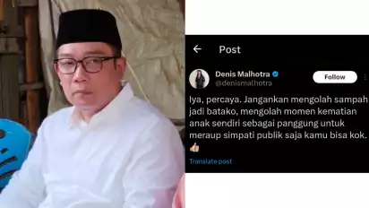 "Iya, percaya. Jangankan mengolah sampah jadi batako, mengolah momen kematian anak sendiri sebagai panggung untuk meraup simpati publik saja kamu bisa kok," tulis akun @denismalhotra, Sabtu.