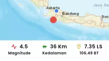 Melansir BMKG, gempa terjadi pada pukul 08:09:18 WIB. Gempa Sukabumi ini berkekuatan Magnitudo 4,5 dengan kedalaman 36 kilometer.