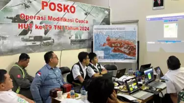 Jakarta, tvOnenews.com - Badan Meteorologi, Klimatologi, dan Geofisika (BMKG) melaksanakan Operasi Modifikasi Cuaca (OMC) di wilayah DKI Jakarta, Banten dan Jawa Barat, untuk mengurangi dampak potensi hujan yang dapat mengganggu rangkaian acara HUT Ke-79 TNI.
