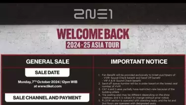 “Sebagai mitra eksklusif penjualan tiket konser 2024-25 2NE1 ASIA TOUR [WELCOME BACK] IN JAKARTA, tiket.com berkomitmen untuk memberikan pengalaman pembelian tiket yang aman, nyaman, dan transparan bagi para Blackjacks di Indonesia. Kami berharap konser ini bisa menjadi momen nostalgia yang luar biasa, sekaligus turut memperkuat industri hiburan dan pariwisata Indonesia," ujar Maria Risa Puspitasari, SVP of Brand Marketing tiket.com dalam keterangannya, Senin (7/10/2024).