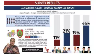 Dalam survei yang dilakukan di 14 Kabupaten/Kota di Provinsi Kalimantan Tengah, pasangan nomor urut 4 ini meraih 46% suara dari 1.200 responden, mengungguli pesaing-pesaingnya dengan selisih yang signifikan.