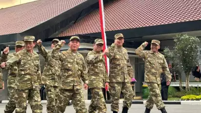 Berdasarkan pantauan tim tvOnenews.com di lokasi, terlihat jajaran Kabinet Merah Putih kompak mengenakan seragam Komponen Cadangan (Komcad).