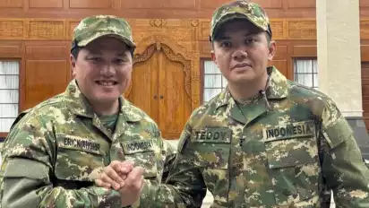 Jakarta, tvOnenews.com - Menteri BUMN Erick Thohir dan Sekretaris Kabinet (Sekab) Mayor Teddy Indra Wijaya terlihat berfoto bersama dengan posisi tangan bersalaman.