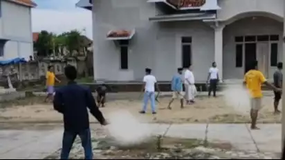 Di potongan video lain, seorang pria bersarung oranye, berkaus biru, dan berkopiah putih terlihat tergeletak di atas tanah.