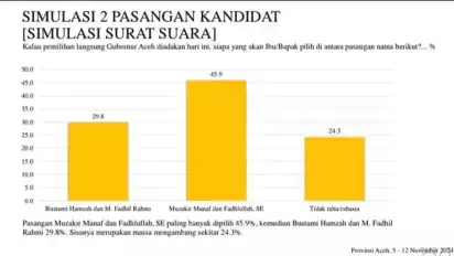 Dalam simulasi tanpa surat suara, Mualem-Dek Fadh unggul dengan elektabilitas sebesar 43,9 persen, diikuti pasangan Bustami-Fadhil Rahmi dengan elektabilitas sebesar 28,2 persen.