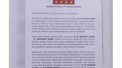 "Karena itu saya H. Prabowo Subianto selaku Ketua Umum sekaligus Ketua Dewan Pembina Partai Gerindra menghimbau, menganjurkan dan memohon kepada saudaraku yang ku hormati dan ku banggakan untuk menggunakan kekuasaan, kedaulatan yang ada di tangan mu. Bantulah negara mu, bantulah bangsa mu, gunakan hak pilih mu untuk memenangkan pasangan nomor urut satu (1) H.M Ridwan Kamil - H Suswono (Rido) sebagai Gubernur dan Wakil Gubernur Jakarta 5 tahun mendatang," ujar Prabowo dalam surat tersebut.(ant)