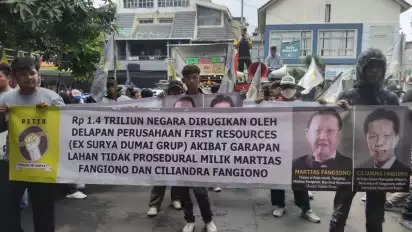 "Kita minta Menko Polkam dan Jampidsus segera memeriksa si "Raja Sawit" Martias Fangiono dan Ciliandra Fangiono, atas kepemilikan 8 perusahaan kebun sawit seluas 16.829,86 hektare, di mana diduga tidak masuk Perolehan Negara Bukan Pajak (PNBP) sebesar Rp1,4 triliun," ujar Korlap aksi Ormas PETIR, Jesayas, dalam orasinya, Kamis (5/12/2024).