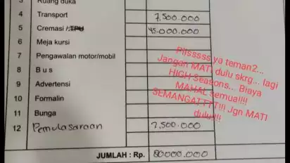 Dalam gambar itu tertera biaya peti jenazah seharga Rp25 juta, transportasi Rp7,5 juta, biaya kremasi Rp45 juta, dan pemulasaran Rp2,5 juta.