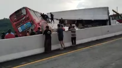 Bus Pariwisata rombongan siswa dari Bogor menabrak truk di Pintu Tol Lawang, Malang.