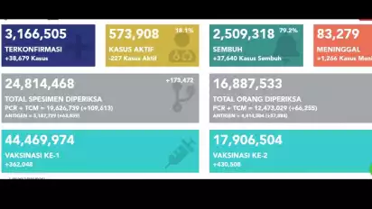 Jakarta – Berdasarkan data Satuan Tugas Penanganan Covid-19 pada Minggu (25/7) tercatat kasus harian terkonfirmasi positif Covid-19 bertambah sebanyak 38.679 kasus sehingga secara akumulasi mencapai 3.166.505.