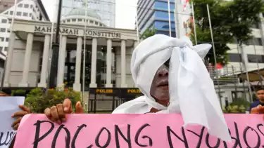 Jakarta, tvOnenews.com — Sejumlah massa menggelar aksi unjuk rasa dengan mengenakan kostum pocong dan membawa keranda jenazah di depan gedung Mahkamah Konstitusi (MK) dan Dewan Kehormatan Penyelenggara Pemilu (DKPP), Jakarta, Sabtu (1/2/2025).
