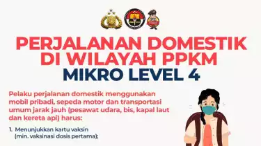 Bagi masyarakat yang melakukan perjalanan domestik menggunakan mobil pribadi, sepeda motor, dan transportasi jarak jauh (pesawat, bus, kapal laut, dan kereta api) di wilayah PPKM Level 4 diwajibkan menunjukkan kartu vaksin, minimal dosis pertama.