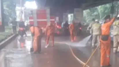 Tampak pula para petugas dari PPSU hingga pemadam kebakaran berupaya membersihkan jalan tersebut.
