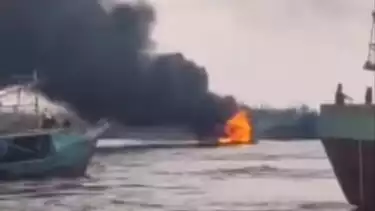 Dalam video yang beredar terlihat api membakar hampir seluruh kapal, nampak pula asap berwarna hitam membumbung ke udara.