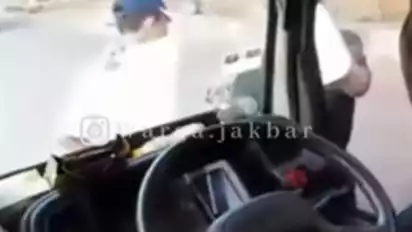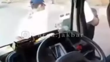 Terlihat dalam video tersebut, bus travel yang tengah melintas dihentikan oleh dua orang pria yang menggunakan topi. Pria itu tampak berada di depan untuk menghadang agar bus tidak pergi.