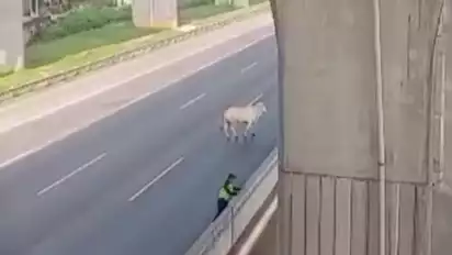 Sapi pun sempat bisa dijauhkan dari jalur tol. Namun, hewan itu kembali berdiri dan berlarian di jalur tol.