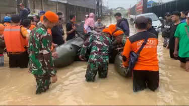 Bekasi, tvOnenews.com - Sejumlah warga masih terjebak di lantai dua dan atap rumah Perumahan Pondok Gede, Kecamatan Jatiasih, Kota Bekasi, Selasa (4/3/2025).