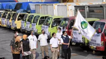 Bantuan beras diangkut dengan belasan mobil dari gudang food station Cipinang, Pulogadung, Jakarta Timur.