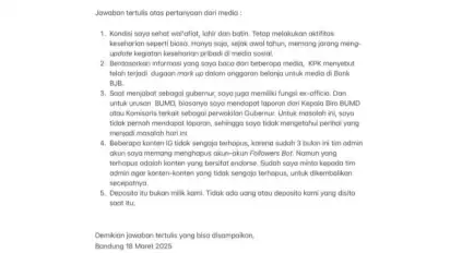 "Deposito itu bukan milik kami, tidak ada uang atau deposito milik kami yang disita saat ini," ucap RK kepada media melalui surat yang disebar ke media massa dengan tanda tangannya, Selasa (18/3/2025).