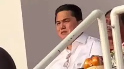 Dari potongan video yang diunggah akun media sosial Instagram topikserucom, Erick Thohir mengenakan kemeja putih tengah menyaksikan pertandingan antara Timnas Indonesia melawan Australia.