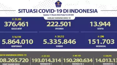 Jakarta - Satuan Tugas (Satgas) Penanganan Covid-19 mencatat kasus positif Covid-19 di Indonesia bertambah sebanyak 16.110, sehingga total kasus sebanyak 5.864.010 hingga Jumat pukul 12.00 WIB.