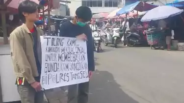 Meski berwajah muram dan tertunduk lesuh, kakak beradik itu tetap membentangkan karton putih bertuliskan ‘Tolong kami,,,kami ingin menjual ginjal untuk membebaskan bunda kami yang dutahan di Polres Tangsel’.
