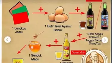 Jamu tersebut terbuat dari campuran satu bungkus jamu, telur bebek atau ayam kampung, anggur kolesom merek tertentu, beras kencur merk tertentu, serta satu sendok madu.