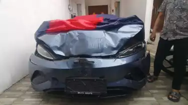 Berdasarkan gambar yang diterima, mobil BYD itu tampak ringsek pada bagian depannya.