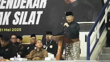 Jakarta, tvOnenews.com - Wakil Ketua Umum Pengurus Besar Ikatan Pencak Silat Indonesia (IPSI) sekaligus Menteri Luar Negeri, Sugiono menghadiri puncak perayaan Hari Ulang Tahun (HUT) IPSI ke 77 di Padepokan Pencak Silat, TMII, Jakarta, Sabtu (31/5/2025).