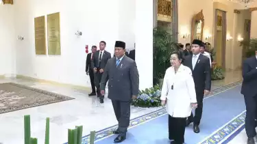 Presiden ke-5 RI yang juga Ketua Dewan Pengarah Badan Pembinaan Ideologi Pancasila (BPIP), Megawati Soekarnoputri, tampak berjalan berdampingan dengan Presiden Prabowo Subianto, menuju lokasi upacara.